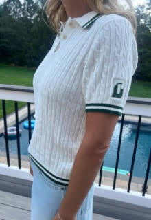 The styling possibilities are endless with the Grace Knit Polo in Cable-Knit. Whether you're on the tennis court, golf course, or taking a stroll to your favorite local coffee shop, this short sleeve classic is sure to become a staple in your wardrobe. Featuring contrasting stripes along the neck, sleeves, and waist.