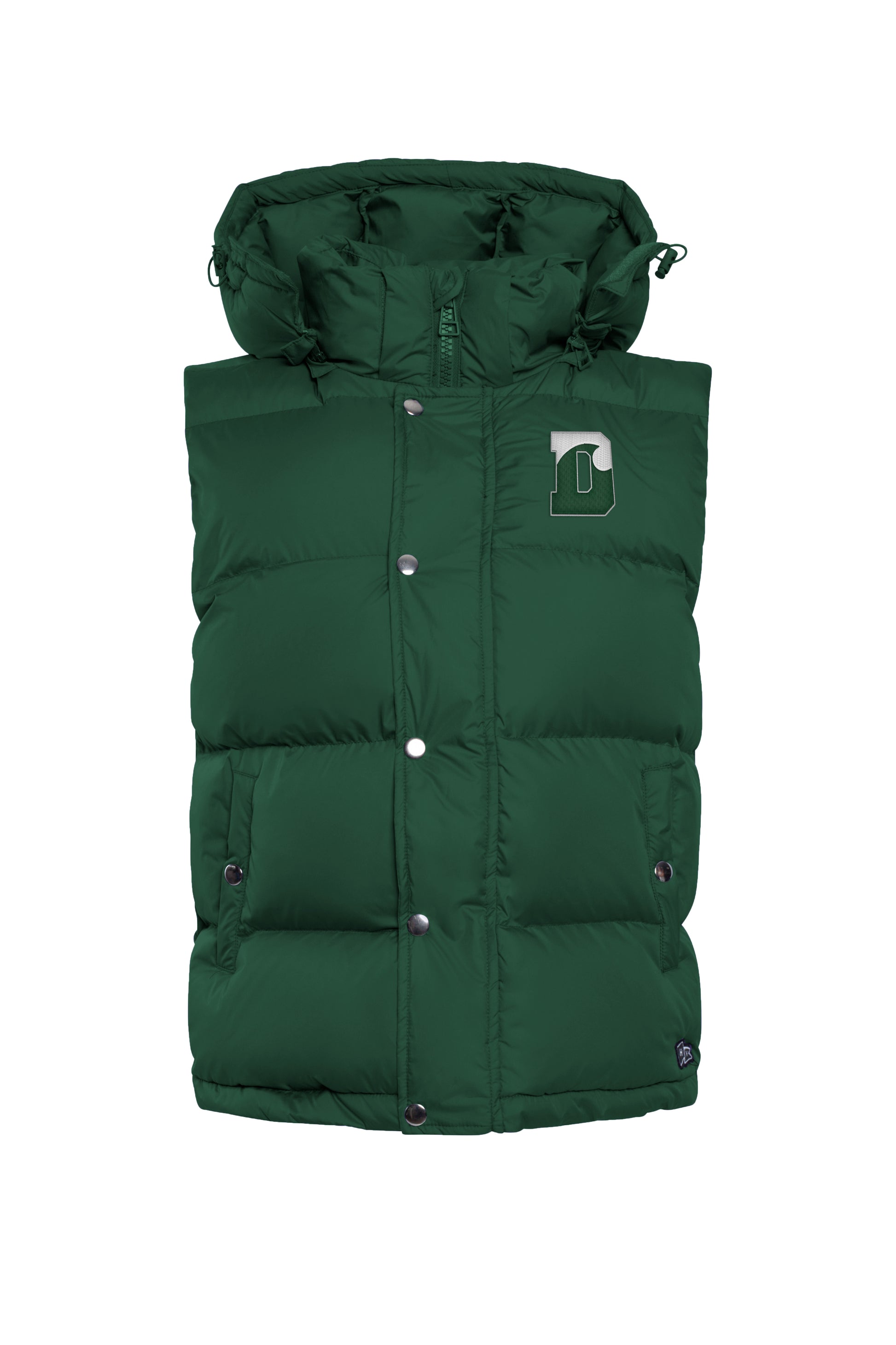 Versatile zipper front puffer vest. Seamed design offers relaxed fit with a removable hood. Finished with an adjustable drawstring hem. A perfect layering piece.