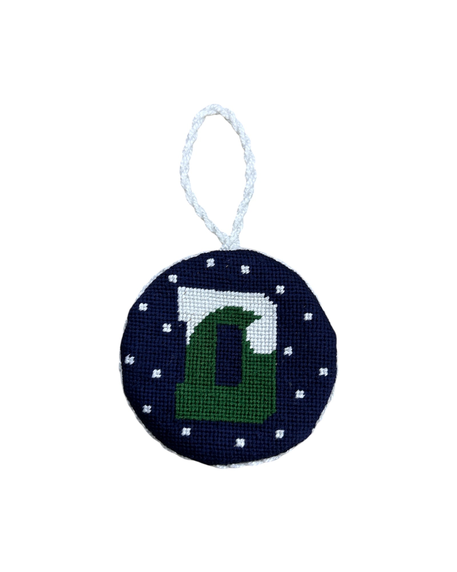 This Delbarton D needlepoint ornament is a timeless addition to any Christmas tree. Each ornament is 100% hand-stitched needlepoint and is accented by a braided white rope cord and flannel backing.