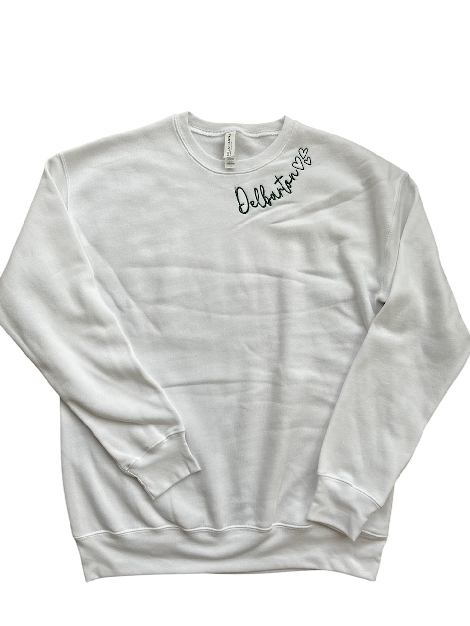 Town Pride LADIES Crew Sweatshirt - Delbarton 3 Hearts - White w/ Hunter Green Embroidery